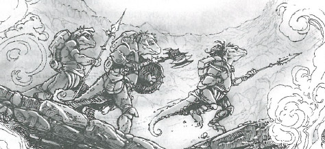 This image (also in the Expanded and Revised 2e Dark Sun Campaign Setting) has three Sssuran traveling over (presumably) lava on the Scorched Plateau. I like how they appear neither good nor evil, just beings going about their business in a harsh world.