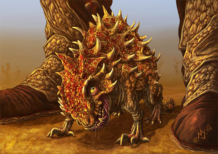 - Boneclaw – Rarely do we see a sense of scale in monsters other than in the text description. I like how this boneclaw (though really it’s more of the size of a true baazrag – see above) is clearly seen as minuscule. We’ve seen a sense of scale before for the baazrag in the Dragon 185 article “Mastered, Yet Untamed” but I this piece is more dynamic and in color to boot.