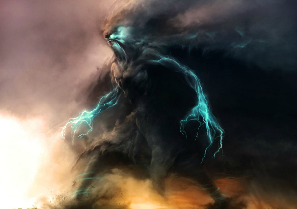 He stood twice as tall as any giant, with a crown of lightning crackling around his head. A constant crash of thunder belched forth from his fang-toothed mouth, and whenever he exhaled, billowing blue fog shot from his gaping nostrils and dissolved in a torrent of rain. His entire body was swaddled in roiling clouds the color of turquoise, and great torrents of salty water poured from the claws at the end of his gangling arms. Even his shadow was part of the tempest, causing the water to chum and froth wherever it fell.