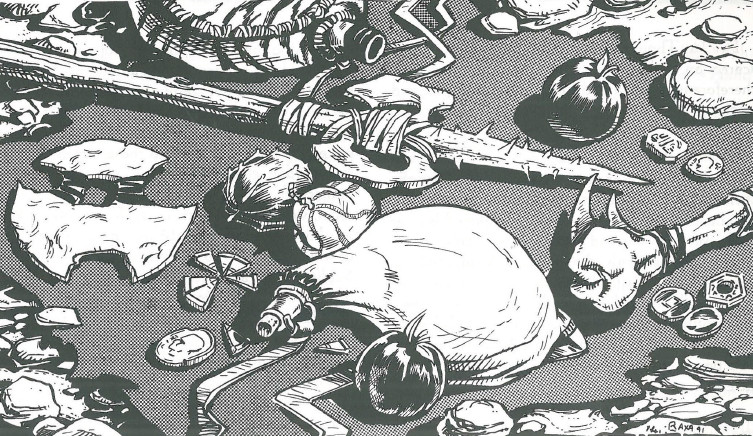 4. Does the weapon as it’s breaking still cause damage? Most of the time. If the weapon breaks, it means the thing it was being used against could not be overcome and so basically loses the Hack and Slash or Volley that may have caused it. One might foresee that breaking a weapon against something might still have an effect (a flower pot being shattered on an enemy’s head to knock him out comes to mind), and so the fiction would drive the outcome.